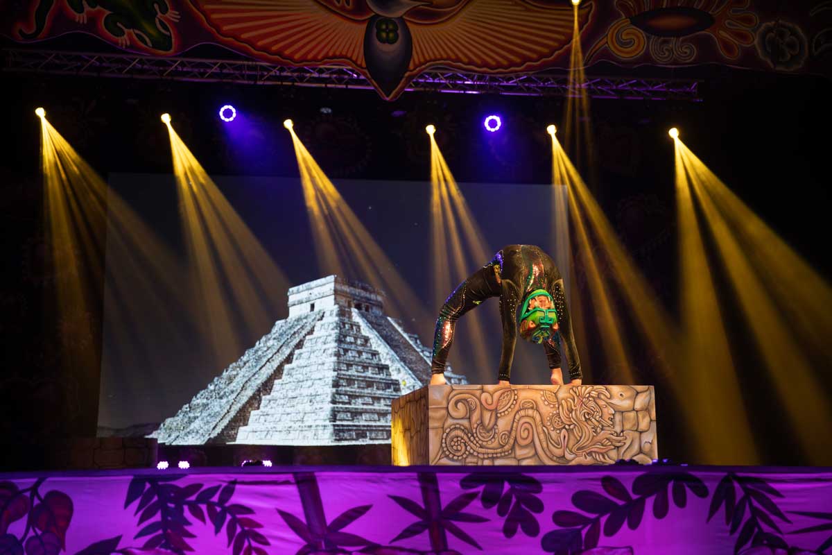 La puesta en escena se divide en varios números como son “La danza de los cuatro puntos cardenales”, “El nacimiento del hombre”, “Aluxes,los seres míticos”, “Kukulcán”, “Los guías espirituales” y muchos más, hasta llegar a la “Leyenda del colibrí” que representa al mensajero de la vida y la muerte. Culminando con la representación del arte popular mixto, que nos muestra una pequeña parte de la majestuosidad que tiene la Cultura Mexicana.
